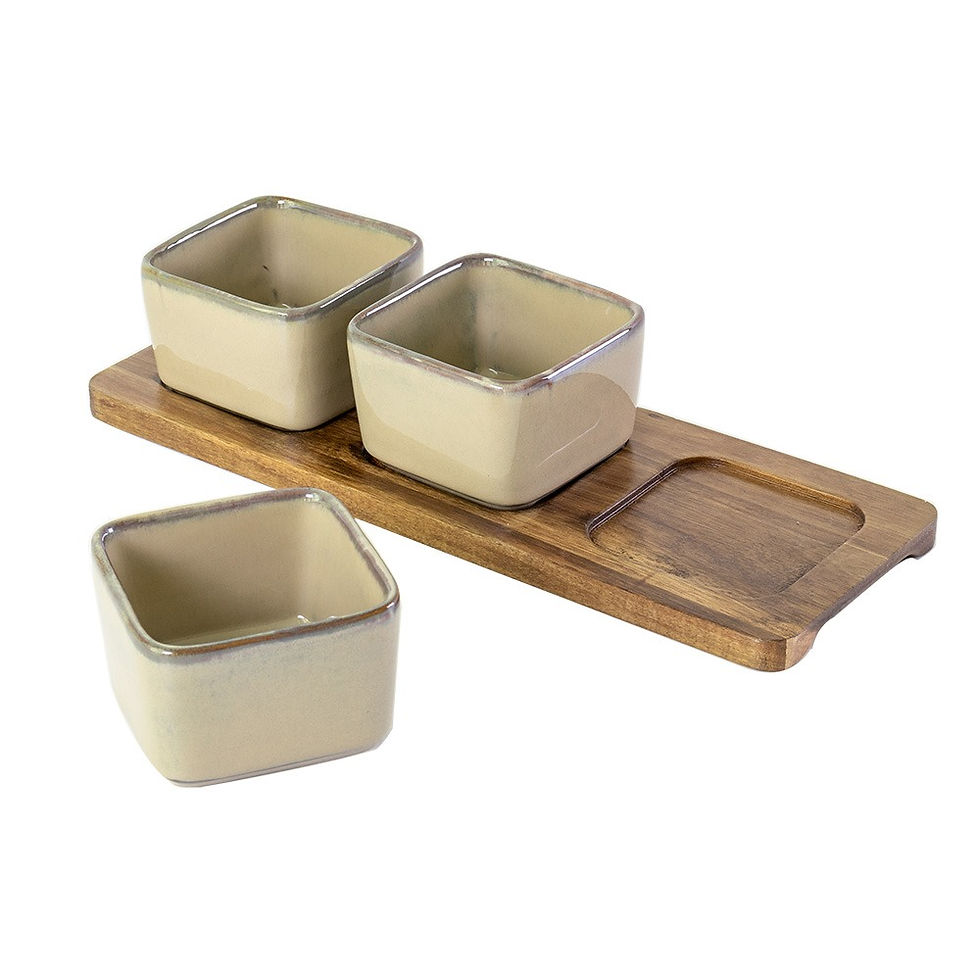 Trio petisqueira cerâmica e madeira nude